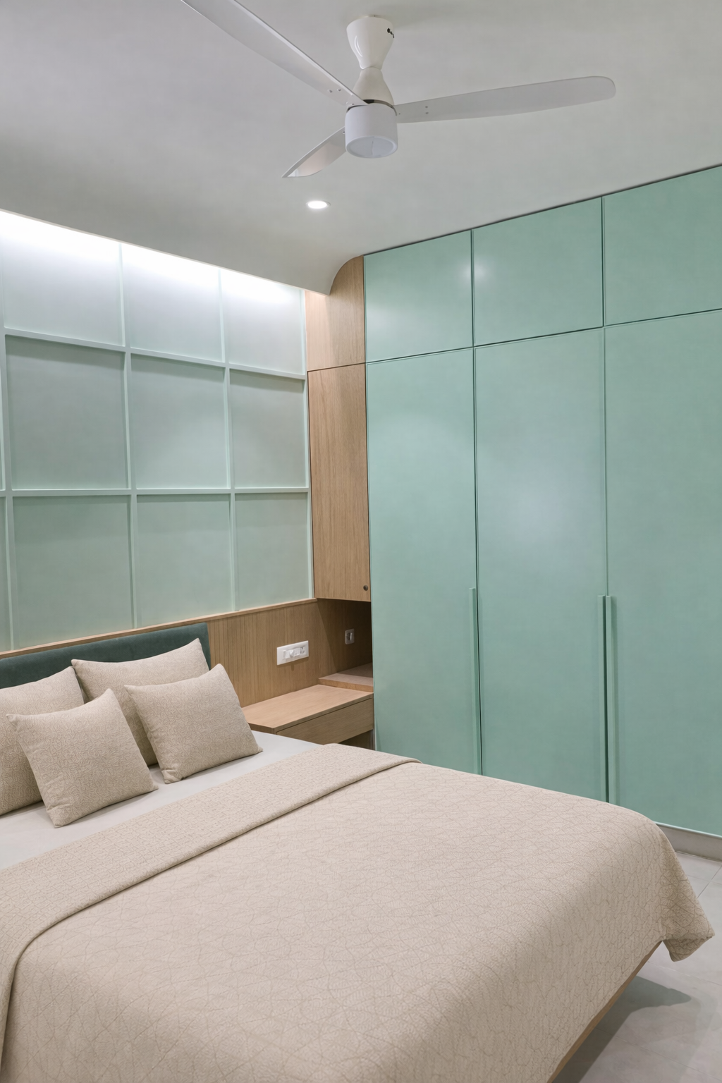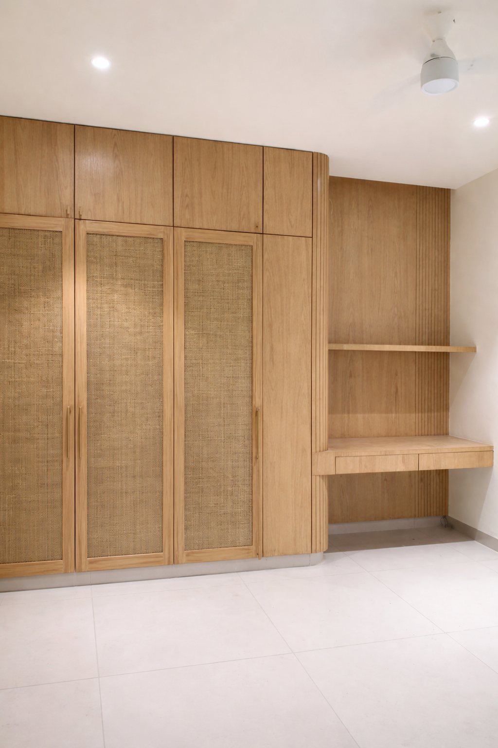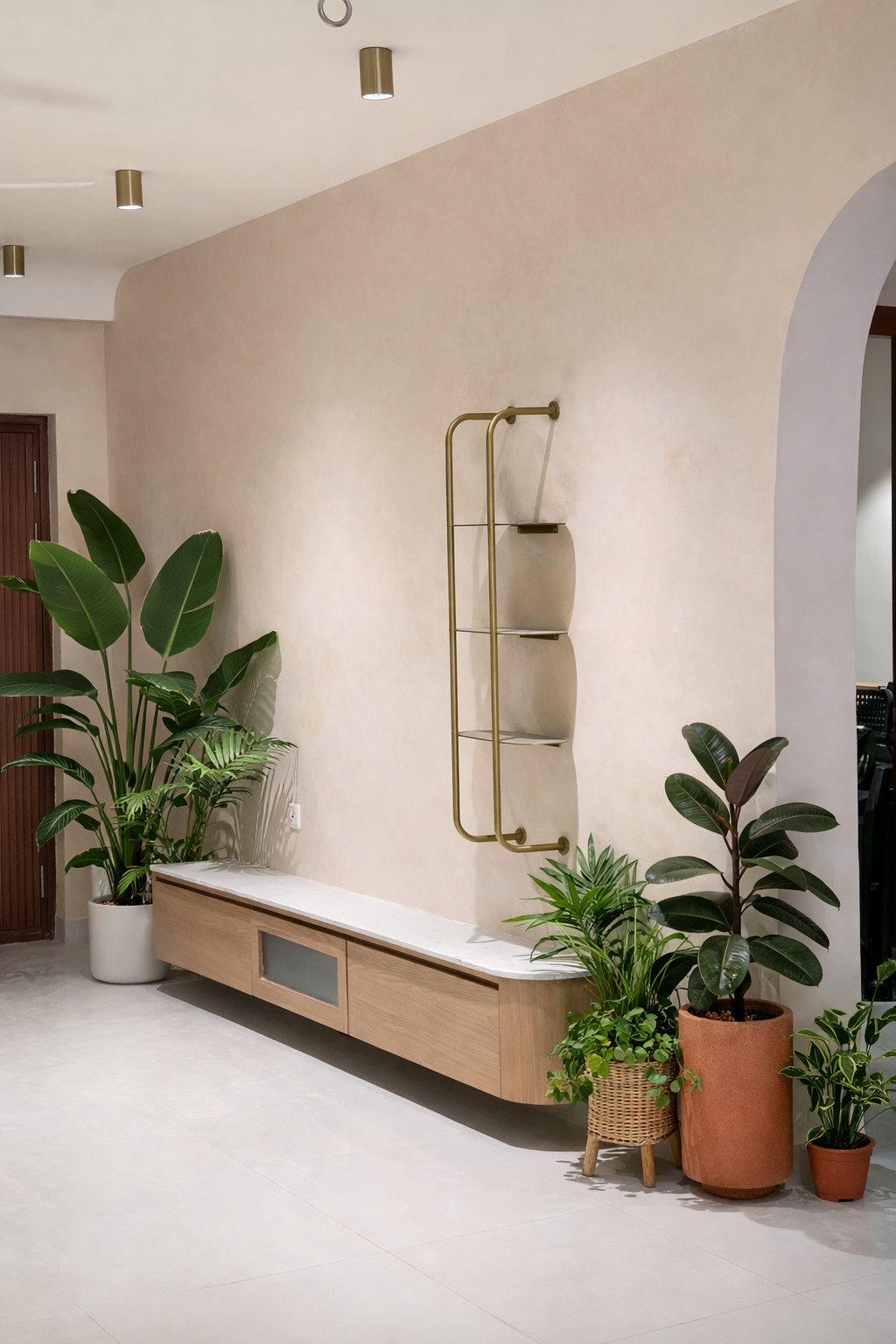 This 3 BHK apartment embodies the essence of Japandi style, blending Japanese minimalism with Scandinavian functionality. The design focuses on creating a serene and calming atmosphere, perfect for a peaceful retreat. Arches and curved ceilings are strategically incorporated to create a sense of flow and softness, these elements add visual interest and depth to the space. Japandi’s signature simplicity is reflected in the clean lines, minimal ornamentation, and careful curation of materials and textures. The use of natural materials, such as wood and stone, adds warmth and tactility to the space, while maintaining the Japandi ethos of simplicity and restraint.