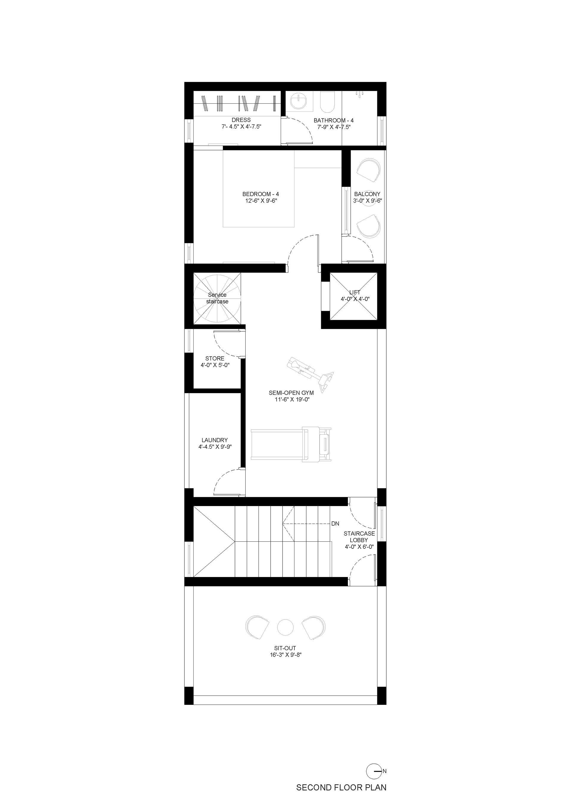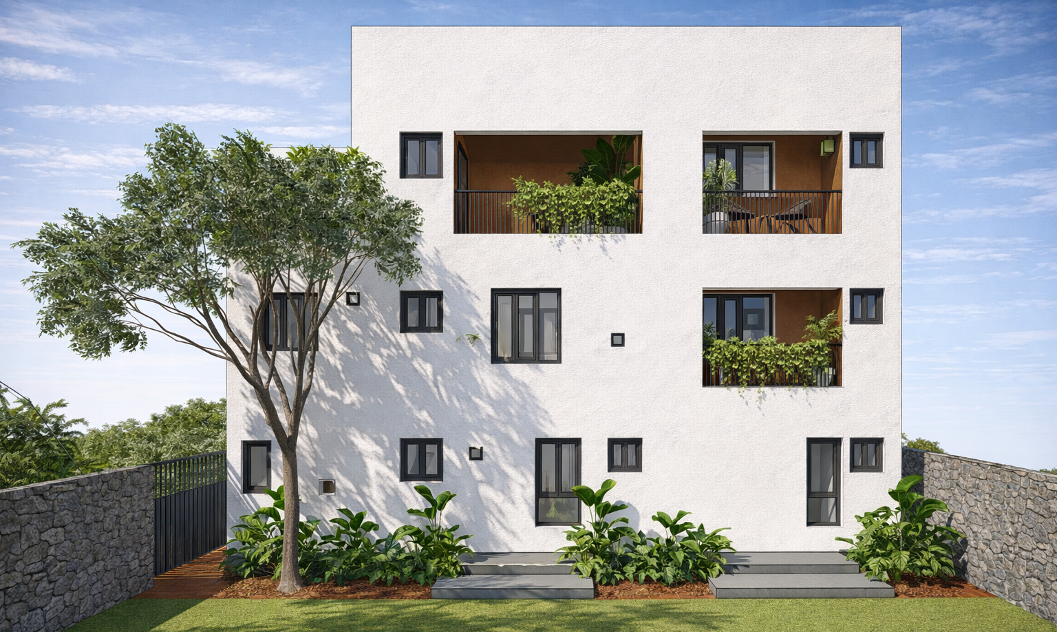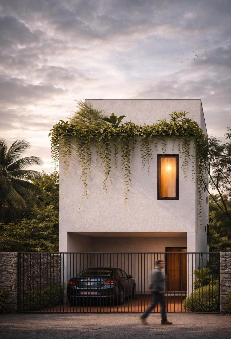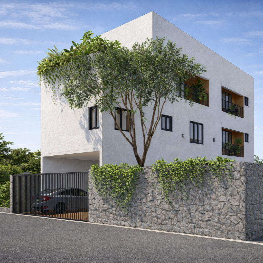 A compact residence in Hyderabad, designed to balance privacy, openness, and everyday functionality within a tight footprint. Public spaces are placed on the ground floor, while upper levels accommodate bedrooms and private family areas. The second floor extends into a semi-open gym and sit-out, reinforcing an indoor–outdoor lifestyle. The architecture is defined by a simple, monolithic form with deep openings and recessed balconies that create shade, reduce heat gain, and integrate greenery into the built form. A restrained material palette—textured white stucco, natural stone, and warm interiors—emphasizes light, shadow, and proportion.