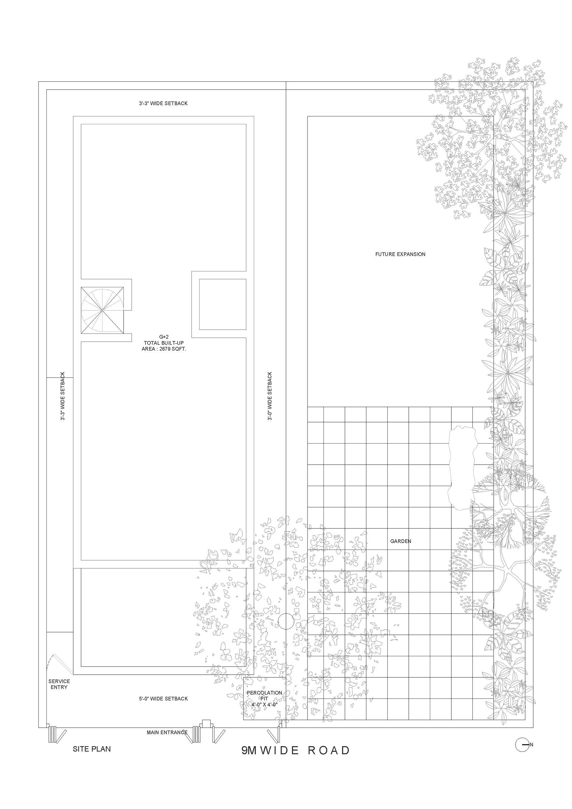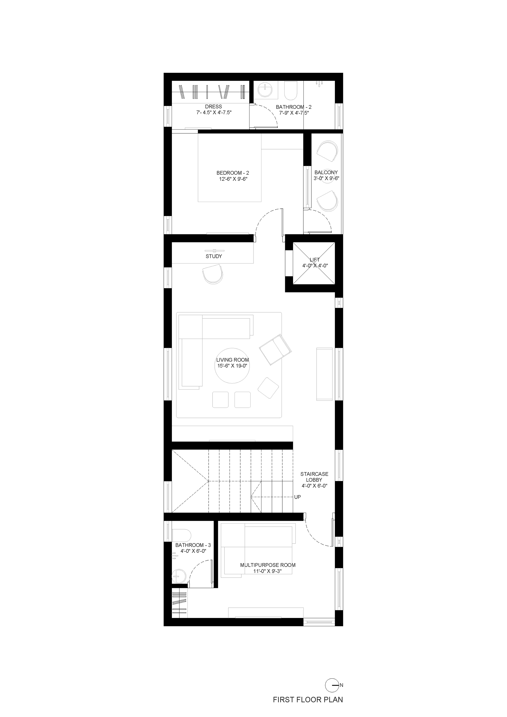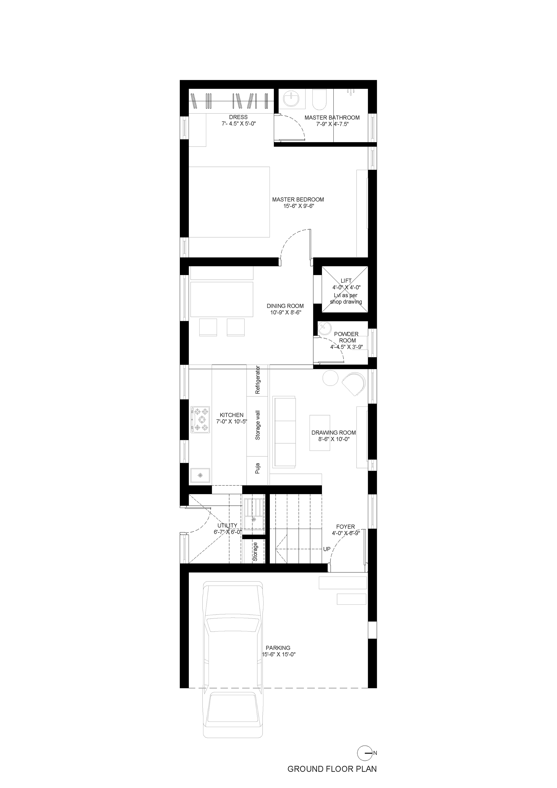 A compact residence in Hyderabad, designed to balance privacy, openness, and everyday functionality within a tight footprint. Public spaces are placed on the ground floor, while upper levels accommodate bedrooms and private family areas. The second floor extends into a semi-open gym and sit-out, reinforcing an indoor–outdoor lifestyle. The architecture is defined by a simple, monolithic form with deep openings and recessed balconies that create shade, reduce heat gain, and integrate greenery into the built form. A restrained material palette—textured white stucco, natural stone, and warm interiors—emphasizes light, shadow, and proportion.