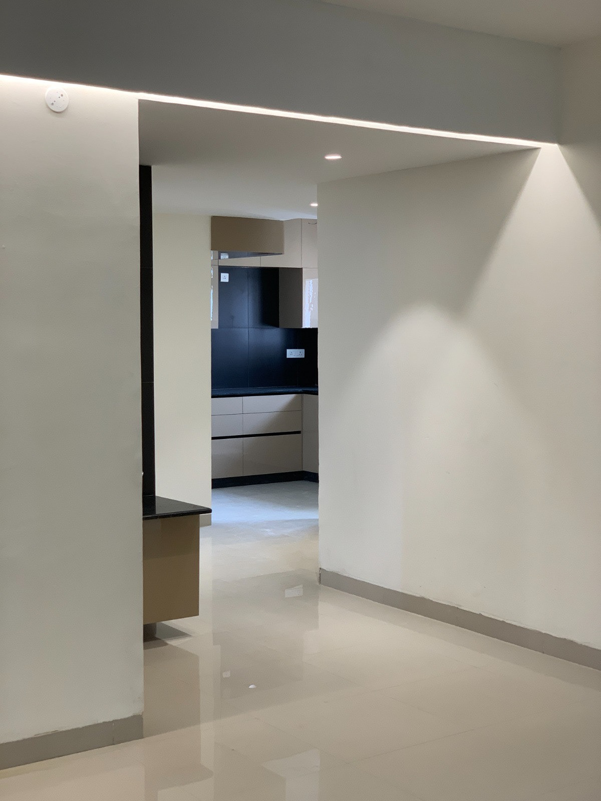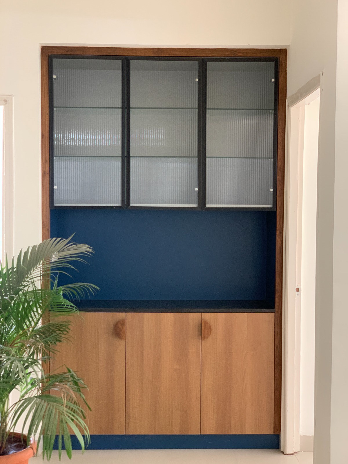 An 1800 sq.ft rental apartment designed with a focus on durability, ease of maintenance, and strong visual appeal. The interiors use a combination of bold, saturated colours paired with warm wooden laminates to create a distinctive yet tenant-friendly environment that stands out in the rental market. Storage units are treated as key visual elements, using colour blocking to add character while maintaining functional clarity. The kitchen reuses the existing stone countertop, complemented by a matching black backsplash to ensure long-term maintenance and stain resistance. Darker tones are strategically introduced across high-use areas to minimise visible wear over time. Ambient lighting is achieved through carefully integrated cove lighting, enhancing spatial quality without extensive structural intervention.